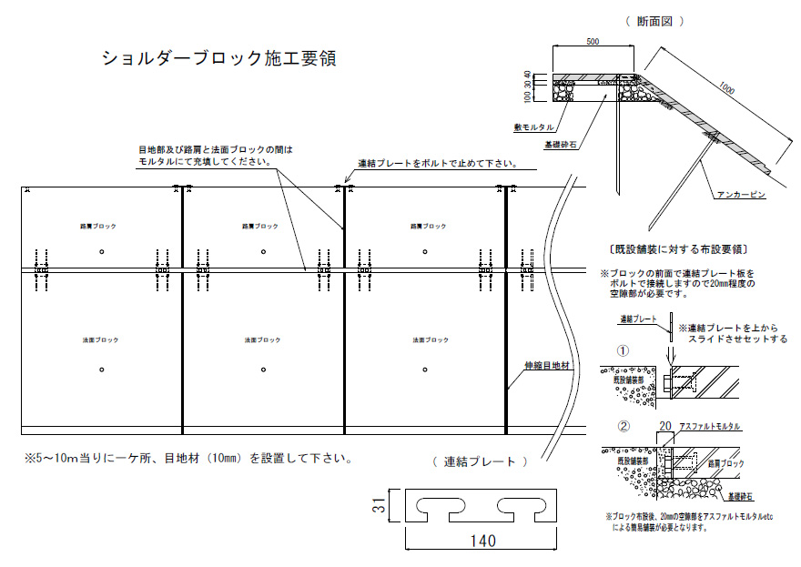 - ⑦ブロック接続は、路肩ブロック前面にプレート板をセットしボルト締めします。